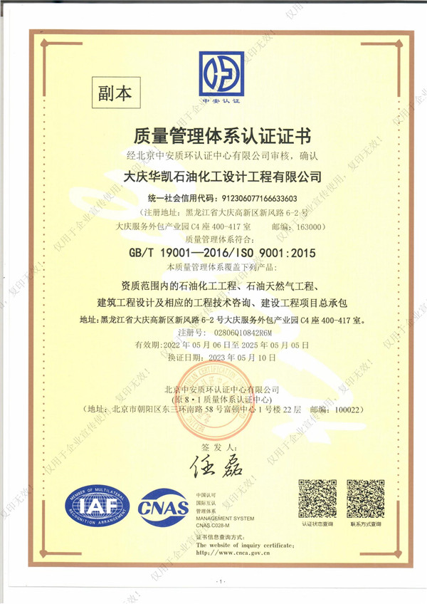 近日,我司順利通過質(zhì)量管理體系認(rèn)證,這標(biāo)志著華凱公司在項(xiàng)目質(zhì)量體系建設(shè)上已經(jīng)達(dá)到了相關(guān)標(biāo)準(zhǔn)。質(zhì)量管理體系認(rèn)證證書的取得同時也是公司各項(xiàng)管理工作的規(guī)范化、標(biāo)準(zhǔn)化的體現(xiàn),是對公司持續(xù)穩(wěn)定健康發(fā)展的重要保證。我們將進(jìn)一步優(yōu)化和規(guī)范各項(xiàng)管理制度,不斷提高體系運(yùn)行的有效性,不斷提高公司的管理水平,共同推進(jìn)公司的快速發(fā)展。自此,華凱公司質(zhì)量管理體系的標(biāo)準(zhǔn)化、規(guī)范化及科學(xué)化又邁上新臺階。
